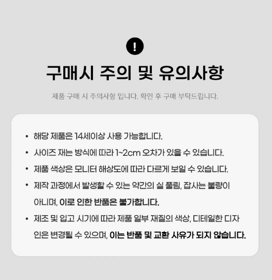 - ±³È¯/¹ÝǰÀº »óǰ¼ö·É ÈÄ 7ÀÏÀ̳» ¿äû ÇØÁÖ¼Å¾ß ÇÕ´Ï´Ù. (ÀÌÈÄ ¿äû½Ã, Á¦Ç°ÇÏÀÚ µî ±³È¯,¹Ýǰ ÁøÇàºÒ°¡ ÇÕ´Ï´Ù)